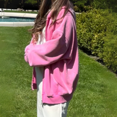 "This hoodie feels like a blanket but looks chic. The Baby Pink color is gorgeous in person. Shipping to France was quick too!"